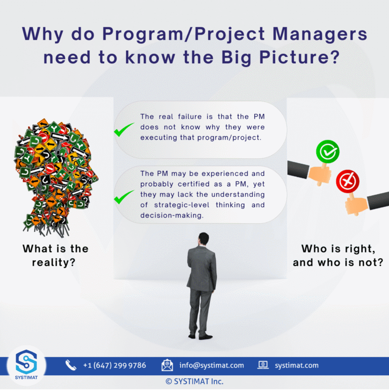 The PM seems to miss the ground realities beyond the scope and boundaries of their program/project. For the PM, their sole responsibility is to keep the triple constraint under control, which is to deliver the assigned scope on time within the approved budget at an acceptable quality level. The concepts of benefits and value delivery may be alien to a PM. For them, the strategic direction, Vision, mission, values, and objectives appear to be fancy words that the senior management uses to impress them and get away with any illogical decision they make.